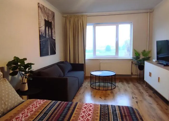 El apartamento dispone de alojamiento en el barrio Latgales priekšpilsēta, aproximadamente a 10 minutos en coche de la Casa del Gato. El centro de la ciudad se sitúa a 3 km y el Aeropuerto internacional de Riga está a 15 km. Puedes dirigirte a las Ezitis Migla, que ofrece comida de europa oriental a una distancia moderada de la propiedad.